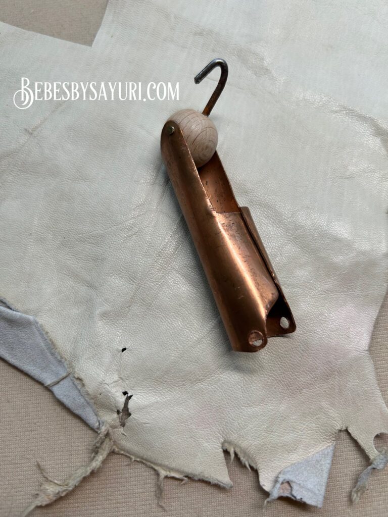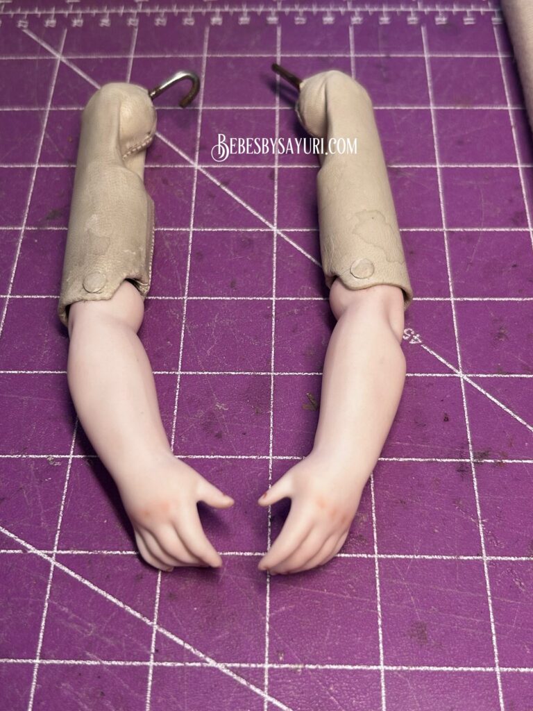 お正月も終わりやっといつもの日常が戻ってきたので、クリスマス前に取り掛かっていたBruのボディ制作を再開しました。このアンティークボデイは胴体と下脚はオリジナルでしたが、ショルダープレートとアームはリプロ製でした。SPにはヘアラインがあり、ビスクアームはボデイに対してワンサイズ大きめだったので、新しく作り直しました。上腕の銅製のパーツはそのまま再利用できたので、ボデイの革となるべく色が合うヴィンテージの革を外側に使って仕上げました。